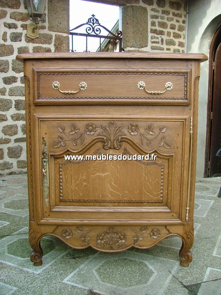 Buffet 2 portes, 3 tiroirs Normand réf DES fleurs de pommier en chêne 100% massif, sculpté à la main. Dimensions : L 142 x H 100x P 55 Fabrication traditionnelle : assemblages tenons et...