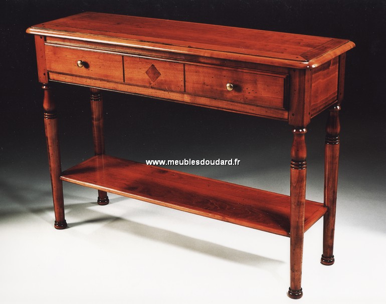Superbe console pieds sabres réf R 1031 en merisier de France 100% massif Fabrication traditionnelle : tenons et mortaises, 3 tiroirs montés à queues d'aronde. Façade et côté en merisier de...