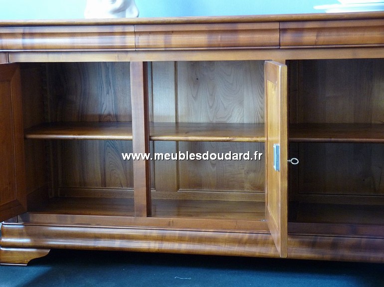 Bahut bas LOUIS PHILIPPE en merisier 3 portes, 3 tiroirs en doucine réf Des, Merisier massif de France, dos, fond, séparations et tablettes, en hêtre massif, châtaigner ou frêne massif, étagères...