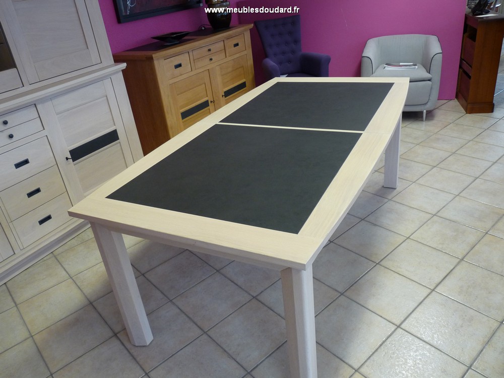 Table rectangulaire avec allonges en chêne massif et panneaux en céramique gris foncé.Fabrication de qualité en chêne massif. Assemblages par tenons et mortaises.2 Allonges en portefeuille de 65 cm...