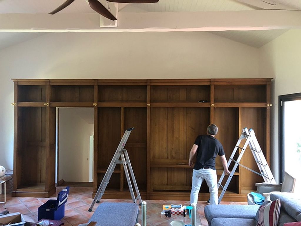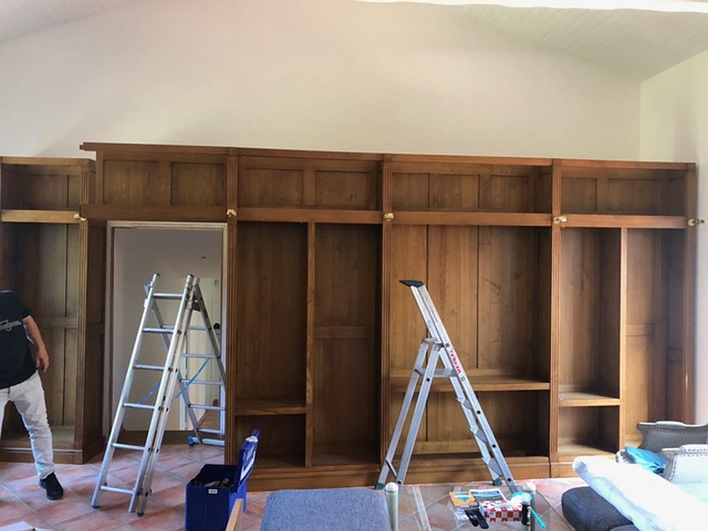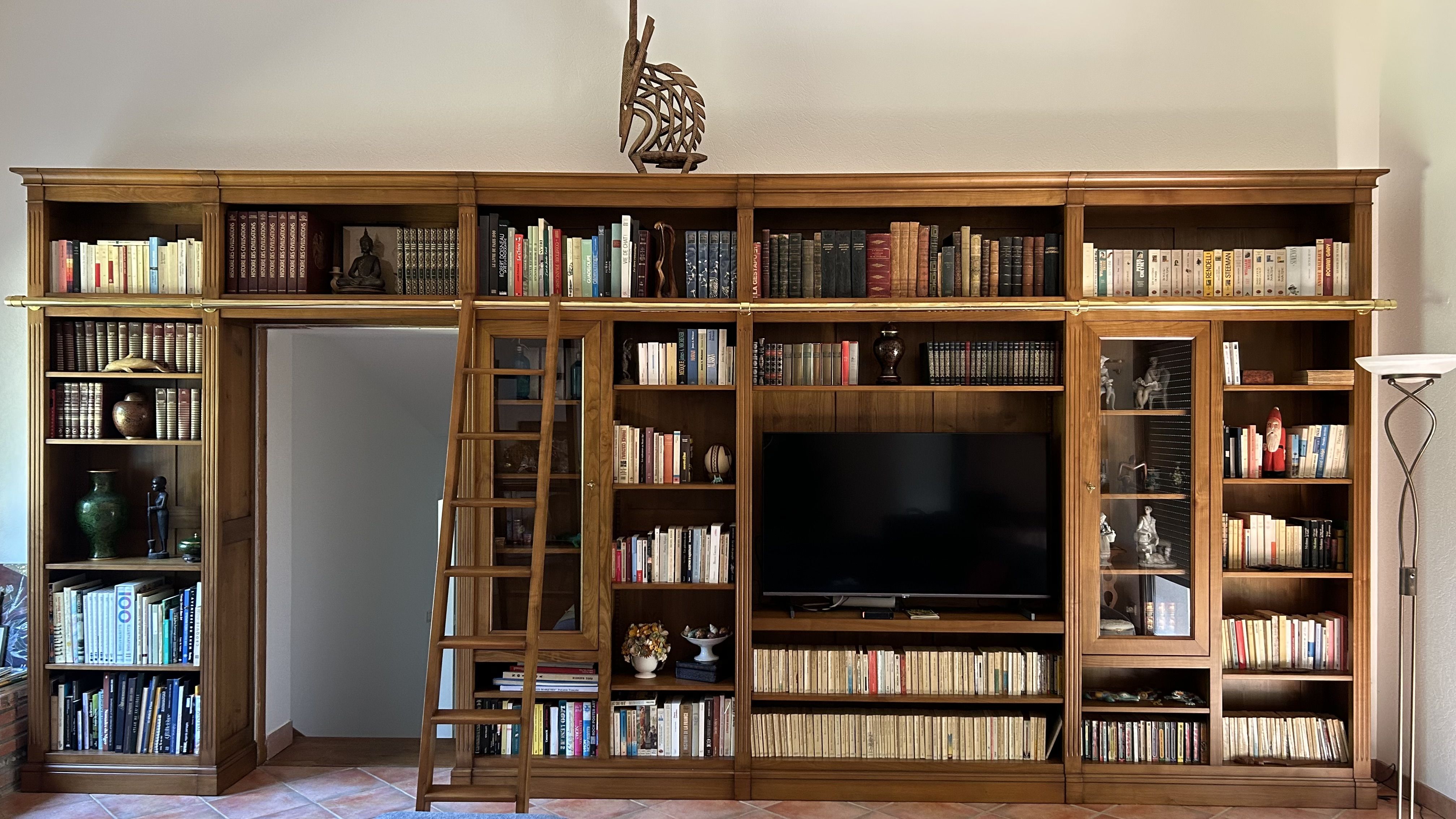 Grande bibliothèque de style directoire sur mesure avec échelle.